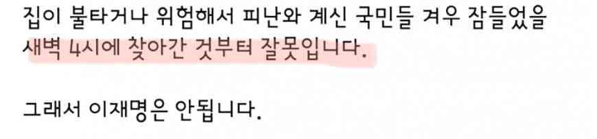 이재명 후보는 유세가 끝난 후에야 새벽 4시쯤 현장을 방문해 이재민들을 위로하고 피해상황과 고충을 들었다.