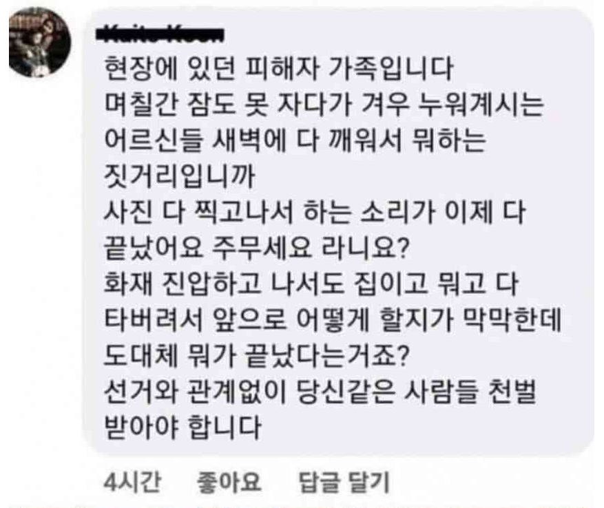 피해자 가족이 폭로한 이재명이 산불현장 가서 사진 찍기위해 4시에 화재 피해자들 깨워서 한 행동들