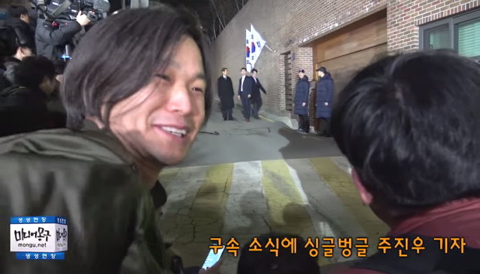 지난 22일 1인 미디어 미디어몽구가 공식 유튜브 채널을 통해 공개한 영상을 보면 주진우 기자는 이명박 전 대통령 구속 소식에 연일 웃음을 참지 못하는 모습이었다.