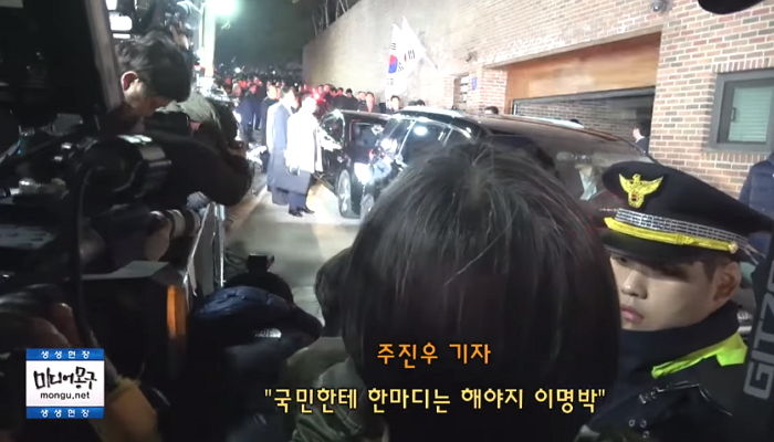 주진우 기자는 또 아무런 입장 발표없이 승용차에 올라탄 이명박 전 대통령을 향해 “아니 말은 해야지 한마디는 해야지”라며 “한마디 해야죠! 국민한테 한마디는 해야지 이명박!”이라고 외쳤다.