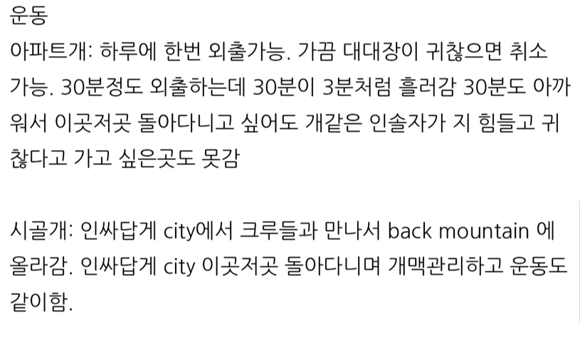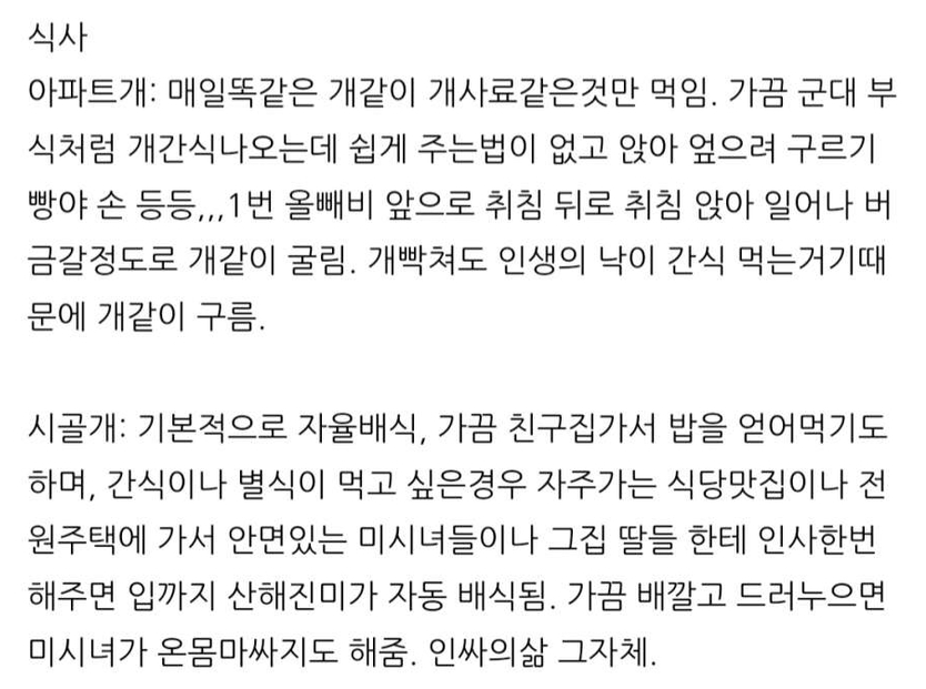 이어서 글쓴이는 “아파트 개는 매일 똑같은 사료만 먹고 가끔 간식이 나오는데 쉽게 먹을 수 없고 훈련을 해야 합니다. 반면에 시골 개는 기본적으로 자율배식이며 친구 집 가서 밥을 얻어먹기도 하죠.”라고 말을 덧붙였다.