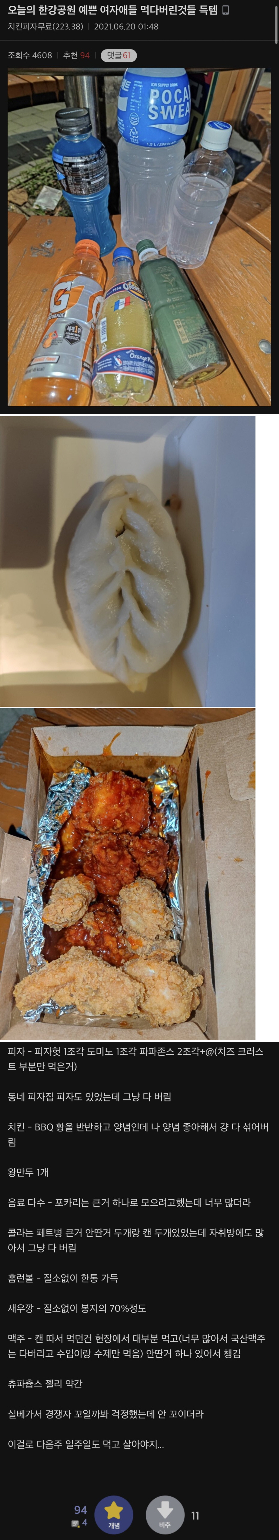 글쓴이는 “주말 저녁에 한강공원으로 가서 쓰레기 버리는 곳을 지켜보고 있으면 사람들이 먹다 남은 음식을 버리고 갑니다.”라며 이야기를 시작했다.
