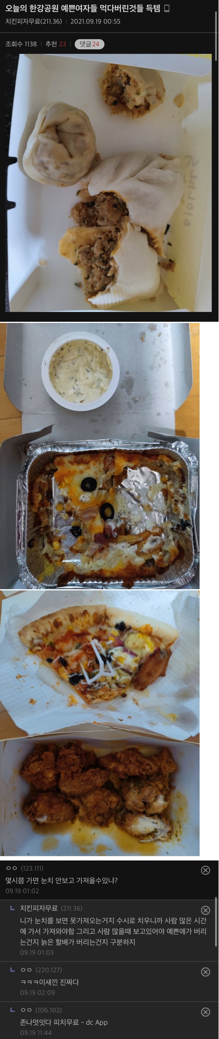 이어서 글쓴이는 “자세히 보면 먹다 남은 치킨, 피자, 분식, 고기, 맥주 등 다양한 음식을 발견할 수 있습니다.”라고 말을 덧붙였다.