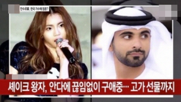 한국의 여가수가 만수르에게 청혼을 받아 결혼하게 되었다는 소문이 돌아 네티즌들의 시선을 모았다.