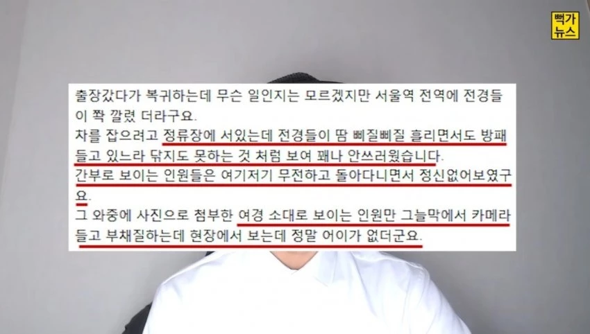 제보글에 따르면, 서울역에 전경들이 쫙 깔린 날 전경들은 땀을 삐질삐질 흘리면서도 방패를 들고 있어 손이 부족해 땀을 닦지도 못하는 것으로 보여 안타까웠고, 간부들 또한 무전기를 하며 정신없이 돌아다니는 상황이었다고 한다.