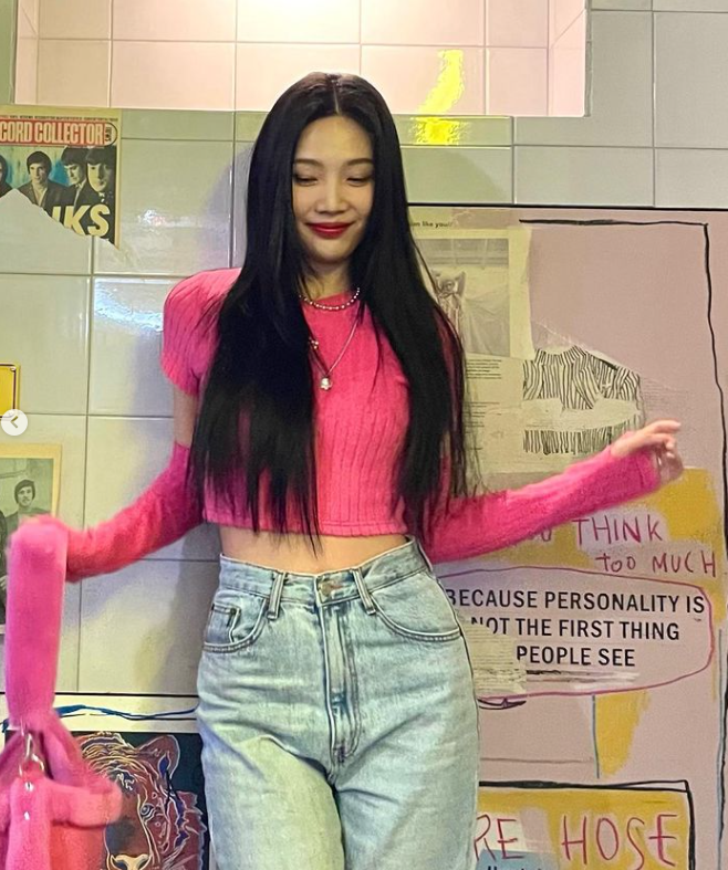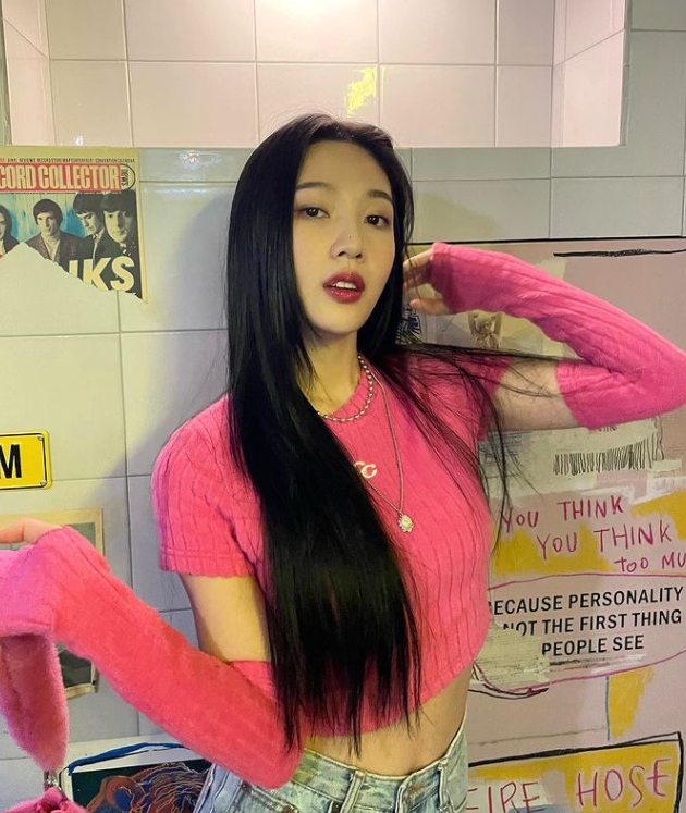 조이는 이날 생머리에 핑크 크롭 니트를 입은 그는 잘록한 허리 라인을 뽐냈다.