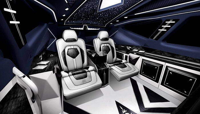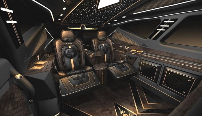 차량 내부엔 각종 조명과 플레이스테이션 게임기가 장착되어 있으며 와이드TV, 냉장고, 커피 머신도 설치되어 있다.