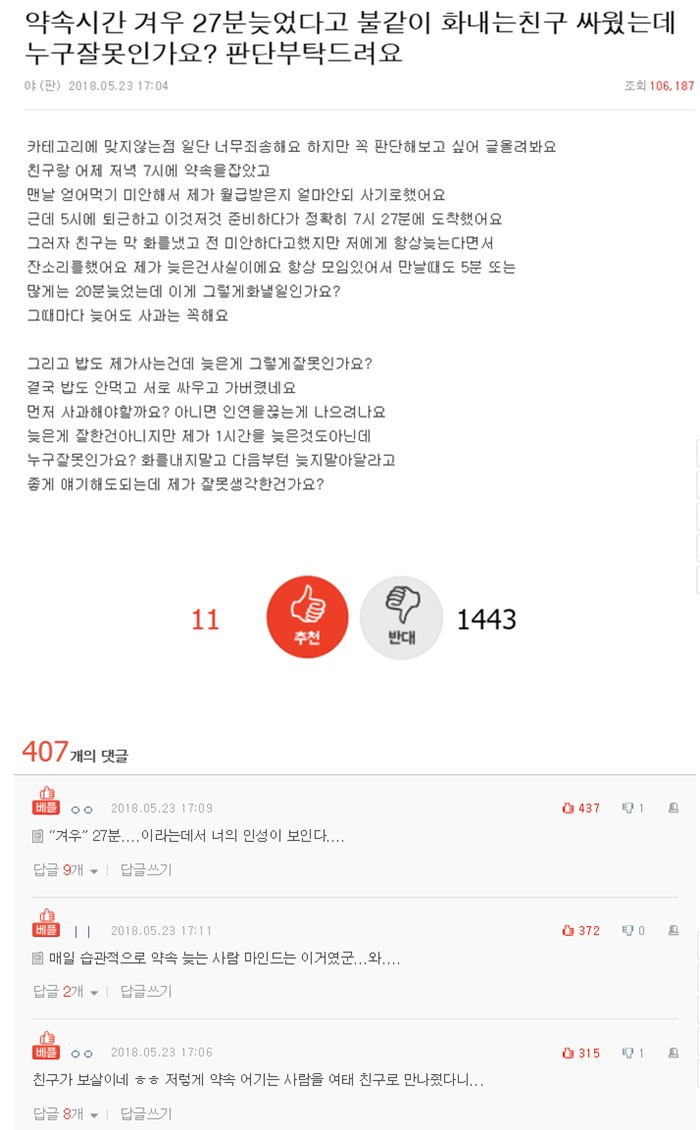 친구와의 약속시간에 늦은 한 여성이 친구와 다퉜는데, ‘어떻게 생각하느냐’며 네티즌들에게 의견을 물었다.