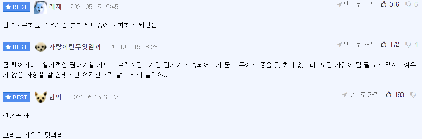 이어서 글쓴이는 “웬만하면 저도 여자 친구와 헤어지고 싶은데 여자 친구가 너무 착해서 어떻게 해야 할지 모르겠습니다.”라고 말을 덧붙였다.