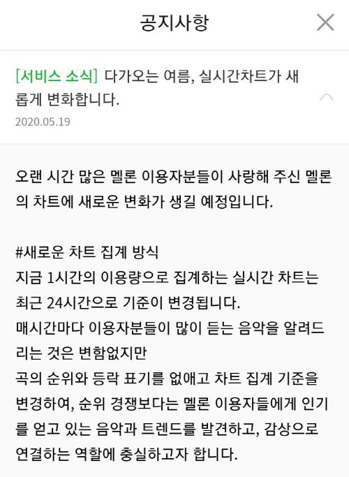멜론은 현재 1시간 단위로 집계하는 실시간 차트 시스템을 24시간 기준 집계 방식으로 변경한다. 또한 24시간 기준으로 1곡당 1인 1회만 집계해 매시 정각에 1시간 단위로 업데이트할 예정이다.