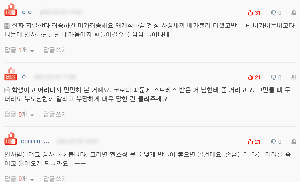 A씨 생각에는 헬스장에서는 사실 그냥 카운터에 앉아있으니,딱히 크게 인사 안하고 들어가고 나오는건 맞지않나 싶고, 이게 대놓고 불려가서 혼날일인지 억울하다 며 심경을 내비쳤다.