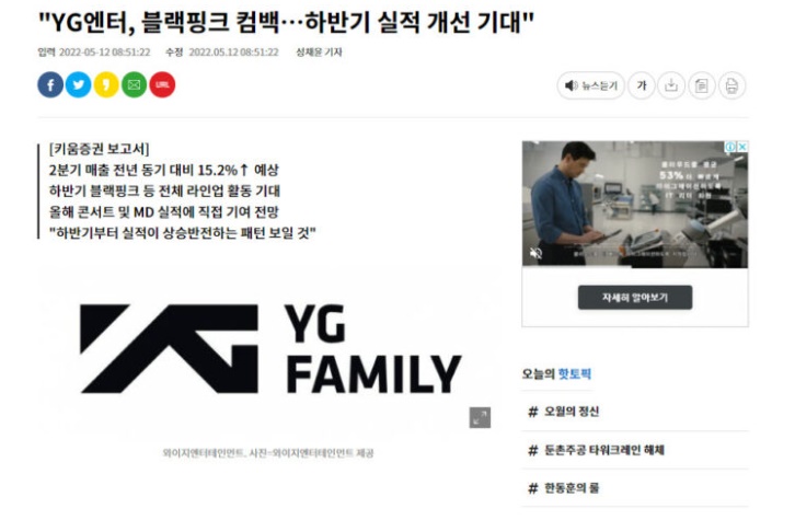 YG는 올 1분기 영업 이익이 전년 대비 36% 하락한 것을 확인할 수 있으며, 실제로 당장 컴백하는 것이 아님에도 블랙핑크를 팔아 주가 하락인 지금 상황을 넘기고 있는 것이다.