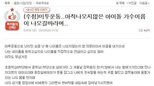 지금까지 언급된 아이돌 관련 미투는 총 3건으로 아직 가해자와 피해자가 드러나고 있지 않고 추측성 기사만 올라오고 있다.