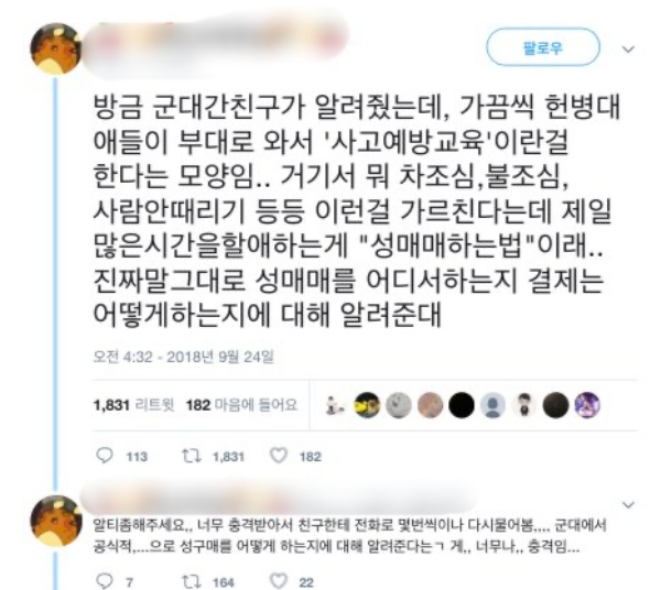 “군대에서 성매매하는 방법에 대해서 가르쳐준데 ;; 미쳤어..!!(쿵쿵!)”