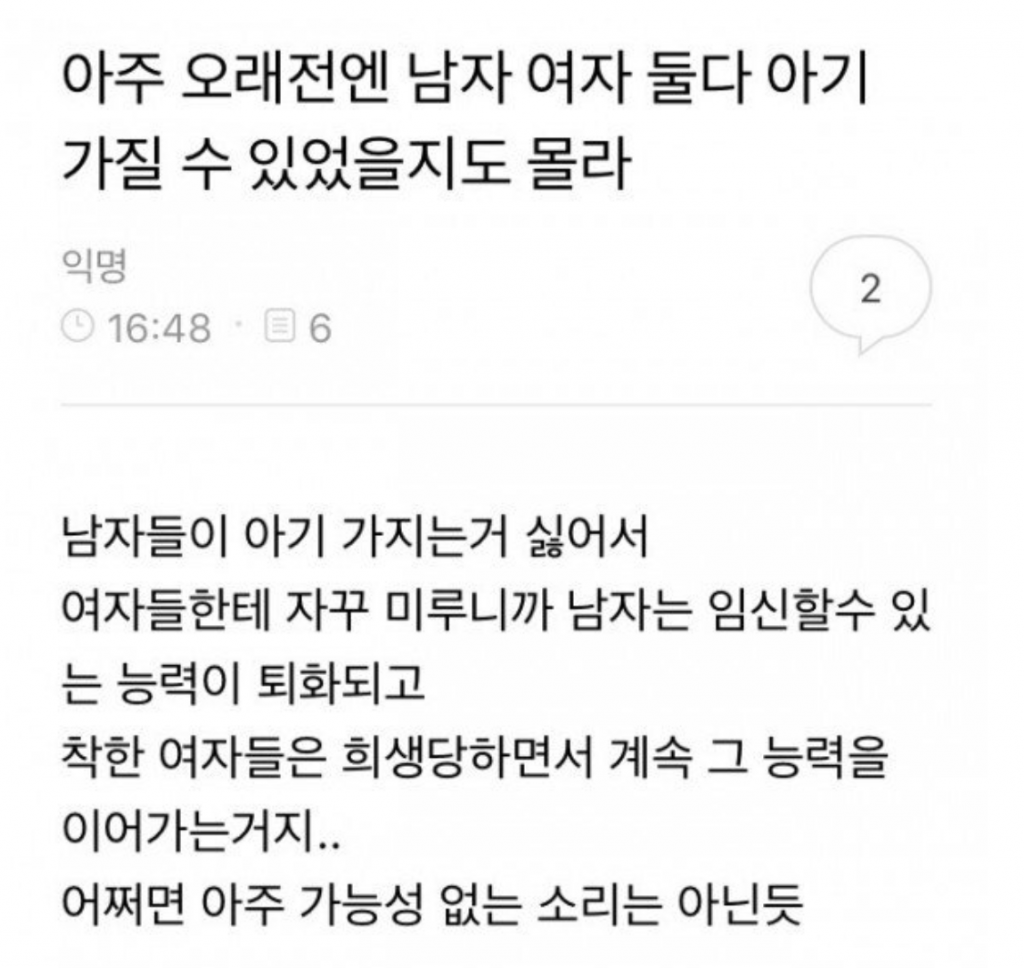 “아주 오래전엔 남자 여자 둘다 아기 가질 수 있었을지도 몰라”라는 제목의 글을 작성했다.