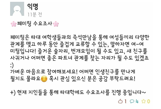 이 미팅의 이름은 “페미팅”으로 여대생들끼리 즉석으로 만나 함께 노는 문화라고 한다. 댓글에 따르면 페미니즘 이야기하는 만남이 아니라 그저 친구를 사귀기 위한 미팅이라고 한다.