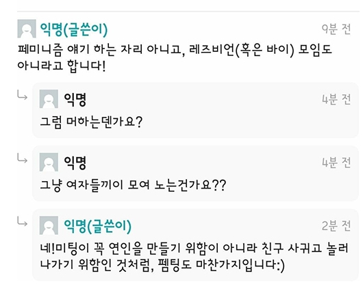 한 누리꾼은 “저렇게 시작해서 페미 전파하는 거구나 ㅋㅋ” “한 쪽으로는 많이 측은해.. 남자들이 미팅을 안해줘서 그러는거잖아..”