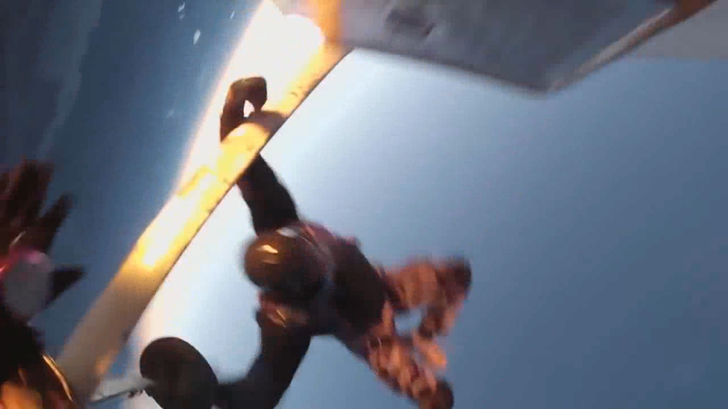 스카이다이빙을 하려고 대기하는 사람들 그런데 갑자기 아래 쪽에서 경비행기가 다가와서 대기하고 있는 비행기에 부딪혀 불이 붙는다.