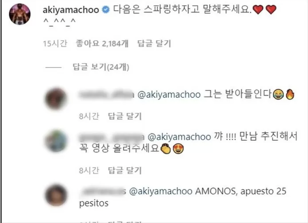 추성훈은 정국의 영상을 보더니 댓글을 통해 “다음은 스파링 하자고 말해주세요”라고 달았다.