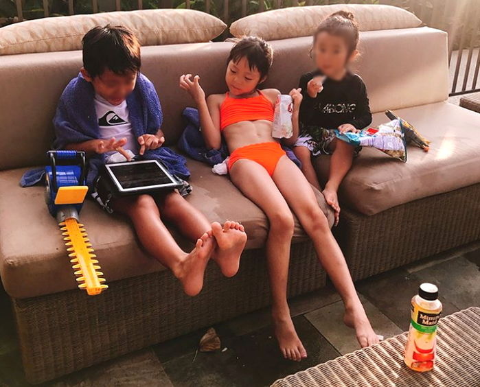 친구들과 함께 물놀이를 하던 중 소파에 비스듬히 앉은 사랑은 또래보다 훨씬 기다란 하체를 자랑하고 있다.