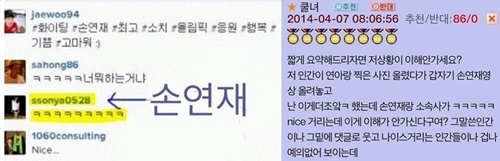 최재우의 게시글에 손연재는 “ㅋㅋㅋㅋㅋㅋ”라는 댓글을 달았고, 이를 본 네티즌들은 “김연아 선수를 조롱하는 거냐”며 비난했다.
