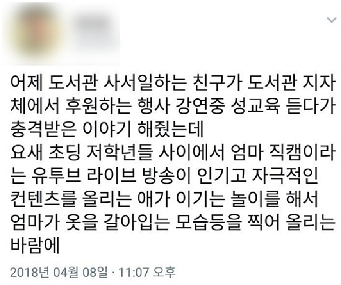 한 온라인 커뮤니티에는 저학년들 사이에서 엄마 직캠이라는 유튜브 라이브 방송이 인기를 끌고 있다는 내용이 제보됐다.