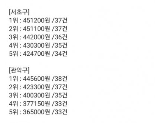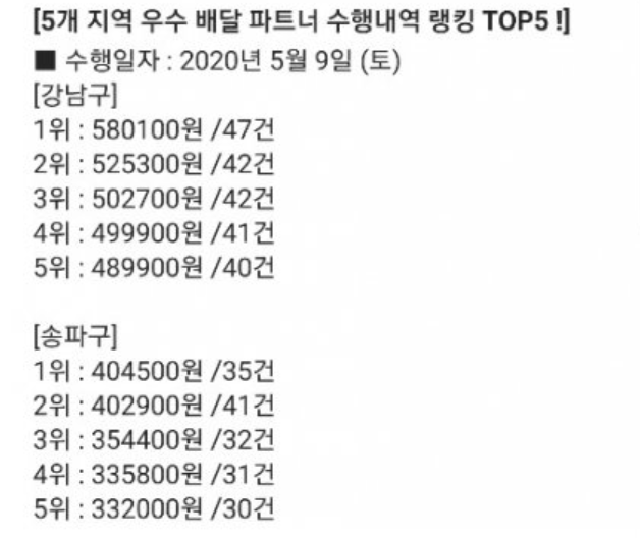 송파구, 서초구, 관악구의 1위 배달원은 40만 4500원, 45만 1200원, 44만 5600원을 기록했다.