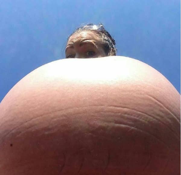 이 여성의 개기일식이 부럽지 않을 만큼 커다란 임신한 복부는 얼굴을 가리고 있다. 이렇게 큰 만큼 고통도 상당하다.