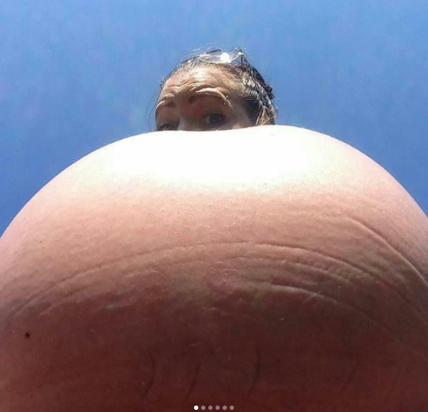 이 여성의 개기일식이 부럽지 않을 만큼 커다란 임신한 복부는 얼굴을 가리고 있다. 이렇게 큰 만큼 고통도 상당하다.