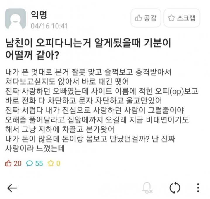 이어서 “오피라고 적힌 거 보니까 성매매업소를 간 것 같은 데 정말 실망이야 내가 돈이 많은데 돈이랑 몸 보고 만났던 걸까? 난 정말 사랑이라고 느꼈는데.”라며 당시 상황을 전했다.