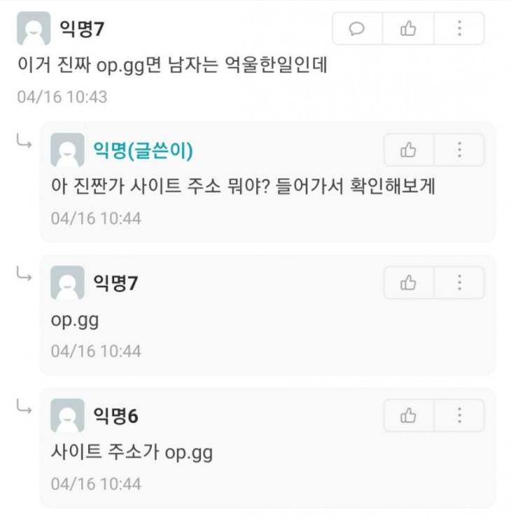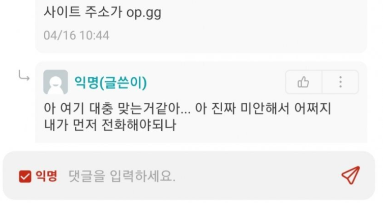 이를 본 온라인 커뮤니티 네티즌들은 “op.gg는 리그오브레전드 관련 커뮤니티인데..”라는 반응을 보였고, 이에 글쓴이는 “아 이 사이트 맞는 거 같은데 진짜 미안해서 어쩌지”라고 답했다.