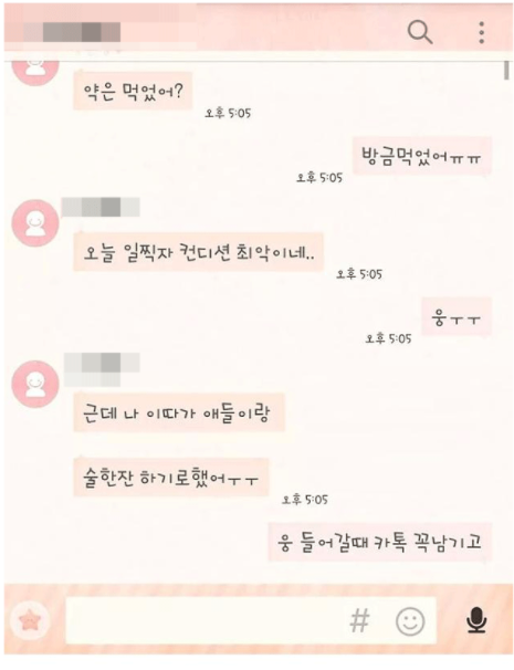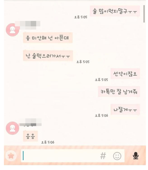 남자친구는 술약속이 생겨서 여자친구에게 미안하다며 일찍자라고 토닥였다.