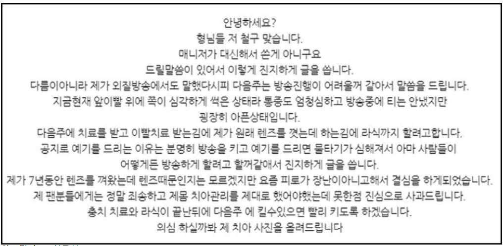 이에 철구는 장기휴방을 선언하며 “팬분들에게는 정말 죄송하고 제 몸, 치아관리를 제대로 했어야 했는데 못한 점 진심으로 사과 드립니다”라고 했다.