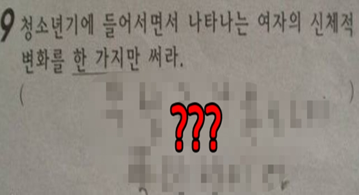 초등학교 시험문제에 “청소년기에 들어서면서 나타나는 여자의 신체적 변화를 한 가지만 쓰시오”라는 문제가 출제한 채점하던 선생님은 예상치 못한 답안지를 받았다.