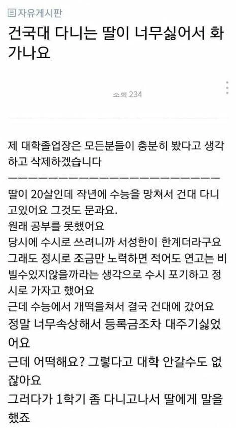 최근 온라인 커뮤니티에 올라온 “건국대 다니는 딸이 너무 싫어서 화가 나요.”라는 제목의 게시글이 화제다.
