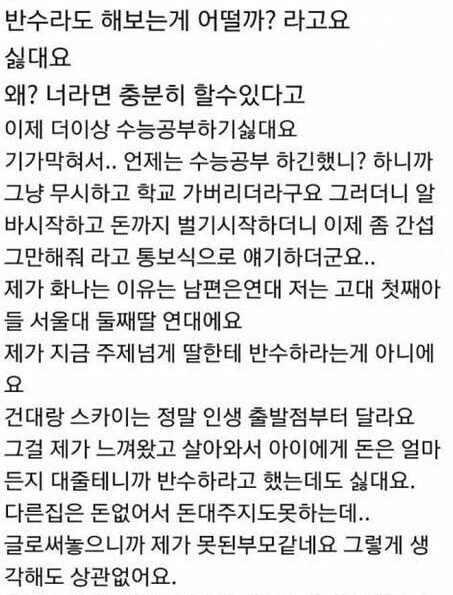 “저는 고대고 남편은 연대 첫째아들 서울대 둘째 딸 연대입니다. 제가 주제넘게 딸한테 반수 하라고 한 게 아닙니다.”라고 당시 상황을 전했다.