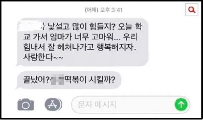 또한 전학간 학교에서도 혹여나 왕따를 당할까 걱정을 한 엄마의 문자가 누리꾼들의 마음을 울리고 있다.