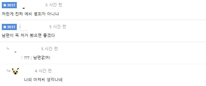 이를 본 누리꾼들은 “저런게 진짜 예비 범죄자 아니냐”, “남편이 꼭 저거 봤으면 좋겠다” 등 다양한 반응을 나타냈다.