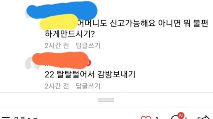 다른 누리꾼은 “어머니도 신고 가능해요 아니면 뭐 불편하게 만드시기?”, “22 탈탈 털어서 감방보내기”라고 댓글을 남기기도 해서 많은 누리꾼들이 이를 보고 충격을 받았다.