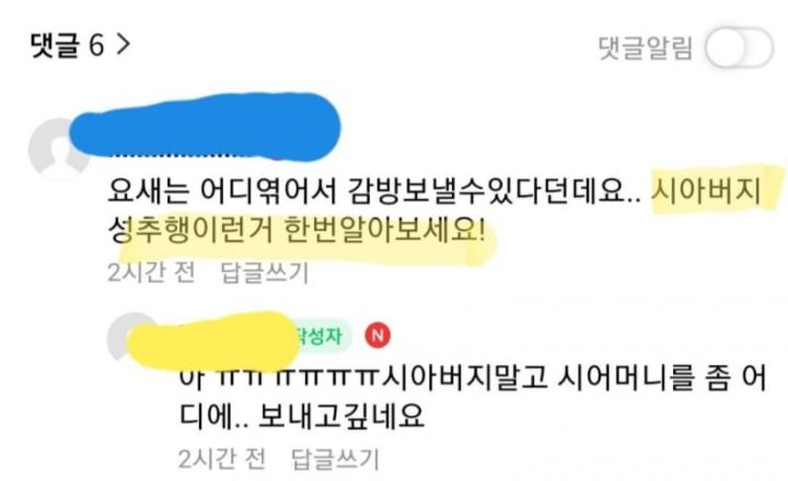 이에 글 작성자는 “아 ㅠㅠㅠㅠ 시아버지 말고 시어머니를 좀 어디에.. 보내고 싶네요”라며 재댓글을 남겼다.