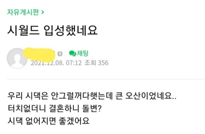 지난 8일 한 여초 카페에는 ‘시월드 입성했네요’라는 글이 올라왔는데, 해당 글 작성자는 “우리 시댁은 안 그럴 거다 생각했는데 큰 오산이었다”, “시댁 없어지면 좋겠어요”라고 불만을 나타냈다.
