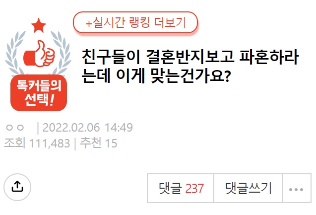 작성자 A씨는 “내 결혼반지 보고 파혼하라고 하는 친구들” 라는 제목의 글로 많은 이들의 궁금증을 이끌었다.