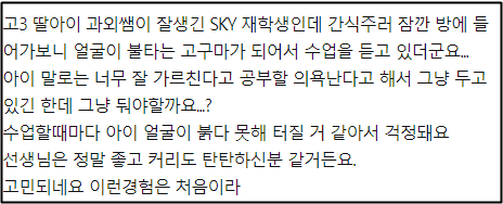 해당 글 작성자 A씨는 최근 과외를 시작한 고등학교 3학년 딸이 잘생긴 과외 선생님 앞에서 극도로 긴장하고 있는 모습을 발견했다.