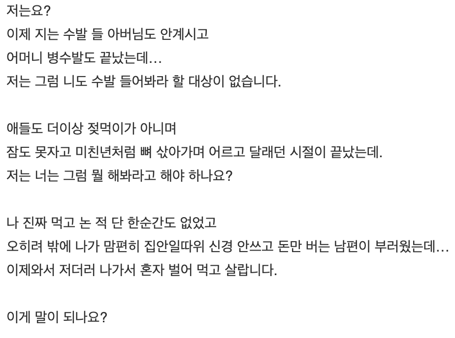 마지막으로 “이제와서 남편이 이러는게 말이 되는 것이냐, ‘너도 수발들어봐라’ 라고 할사람도 이제 없다”며 “그동안 오히려 집안일 신경 안쓰고 돈만 버는 남편이 부러웠다”며 억울함을 표현했다.