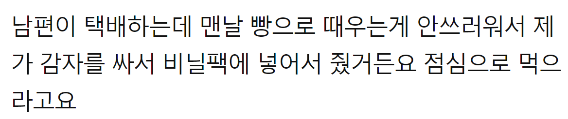 A씨는 “남편이 택배하는데 맨날 빵으로 때우는게 안쓰러워서 제가” 라 첫 문장을 전했다.