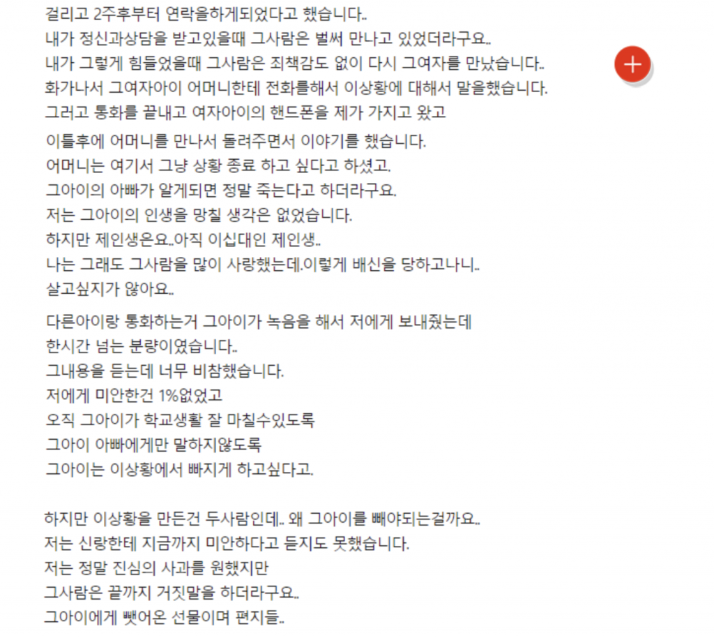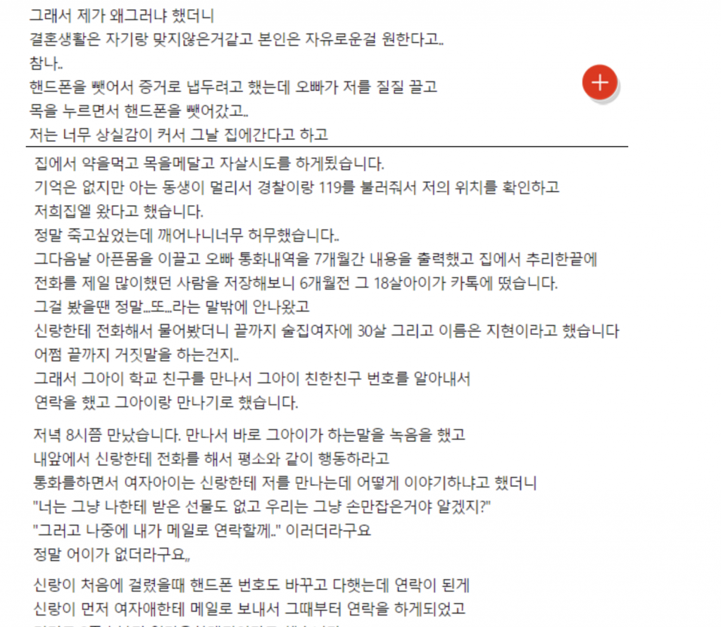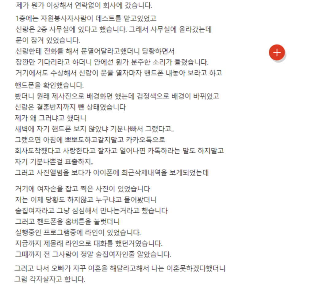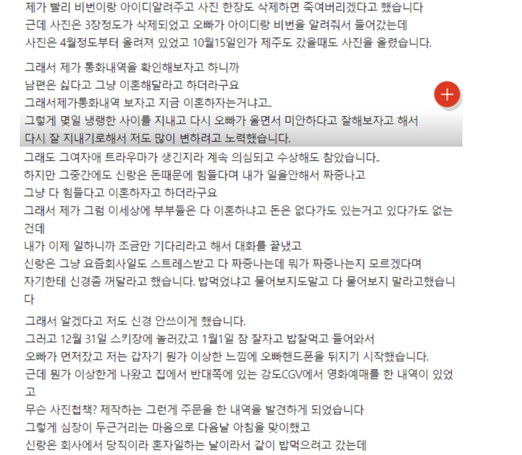 그렇게 수상한 점이 계속해서 발견됐는데, 남편이 자신 몰래 만든 인스타 계정을 들켰고 통화내역을 추궁하자 갑자기 이혼 해달라고 요구하기 시작했다.