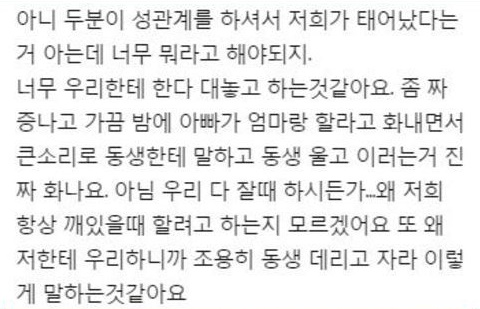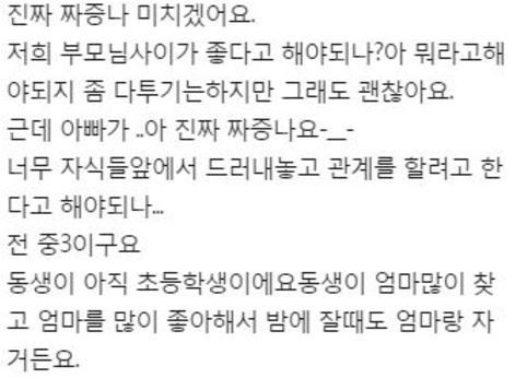 아빠랑 엄마한테 말을 하려고 해도아빠가 좀 자존심도 강하고 말을 하면 목소리가 높아지시고 제가 그런 말을 하면저희 아빠는니 나이가 몇인데 엄마아빠 서로 좋아서 하는 행동도 이해 못하냐고 그러시거든요ㅠㅠ