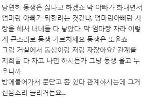 나중에 엄마가 동생이름 부르니까 동생이 벌떡 일어나서 큰방가서 울다가 엄마랑 동생이랑 거실로 오는 겁니다.