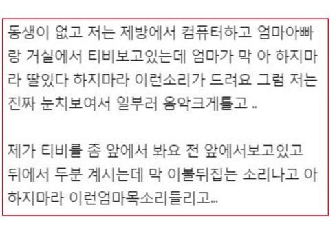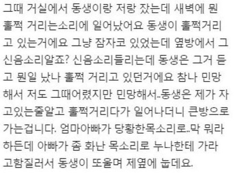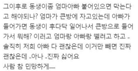 엄마는 제가 자고있는 줄 알고제 옆에 앉아서 동생 토닥거리는데그… 냄새 있잖아여 냄새…아나ㅠㅠㅠ그때 전 초딩이었거든여ㅠㅠㅠ