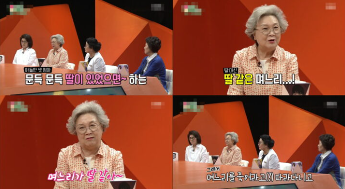 SBS 예능 프로그램 ‘미운 우리 새끼’에 출연한 박수홍의 어머니가 “아들만 셋이라, 딸이 있었으면 좋겠다”, “며느리가 딸 같아서 죽어라, 따라다니고 있다. 딸 같은 며느리가 들어왔으면 좋겠다”라 자신의 며느리에 대한 바램을 밝혔다.